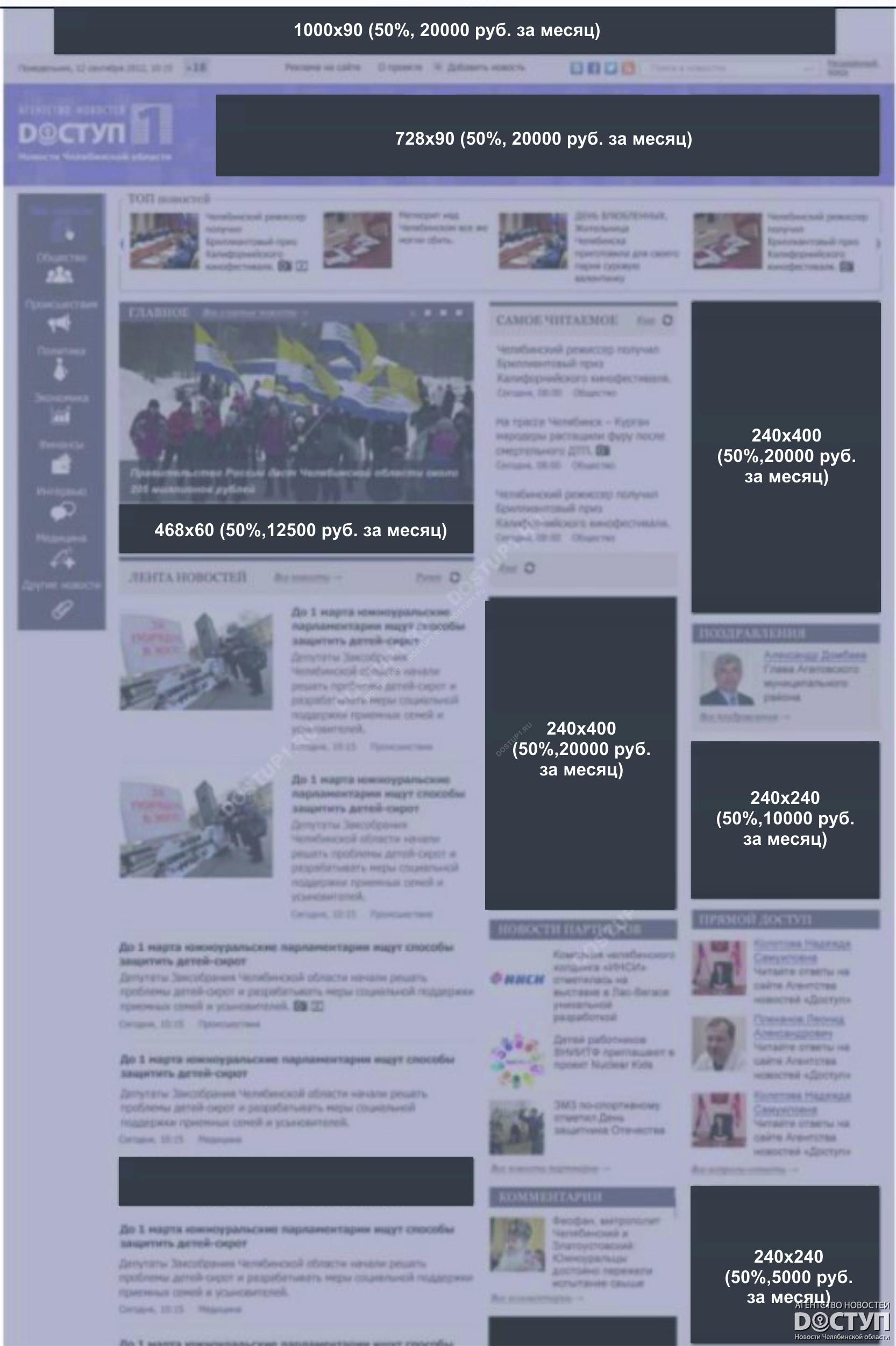 Баннер размещается в рубриках: Главное, Общество, Политика, Экономика, Медицина, Происшествия, Интервью, Финансы, Комментарии, Фотодоступ, Видео, Новости партнеров. (сквозной по всему сайту).