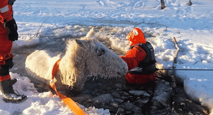 «К счастью, лошадь продолжала самостоятельно стоять, но из-за сильного переохлаждения двигаться была не в состоянии. Спасатели пропилили лед, организовав дорожку к суше. В это время на суше другая группа спасателей при помощи альпинистского снаряжения и подручных материалов изготовила носилки. Чтобы поднять лошадь и на руках вынести из воды потребовались усилия 10 спасателей», – рассказали в Поисково-спасательной службе Челябинской области.
