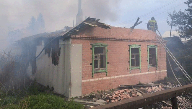 Электрические провода, питающие дом, отгорели, упали на землю и были отрезаны от столба. Однако при подаче воды участники тушения пожара почувствовали, что объект все равно находится под напряжением.