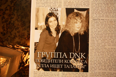 - На прослушивании в ресторане «Шатильон» Алла Борисовна выглядела великолепно: цветущая и свежая. «В сто раз лучше, чем на видео, на фото и по телевизору». Была одета в то, что производит ее фирма: черного цвета сапоги «Алла Пугачева», черный балахон «Алла Пугачева» плюс бриллиантовое колье, которое «стоит, наверное, как пятиэтажный дом».