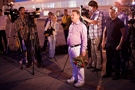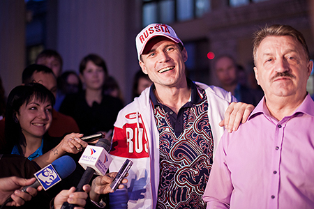Самолет из Москвы приземлился в челябинском аэропорту Баландино в 5.15 по местному времени. В виде исключения журналистов пустили на взлетно-посадочную полосу. Те, переминаясь с ноги на ногу, чтобы не замерзнуть, обсуждали олимпийские поединки наших земляков, сокрушались по поводу судейства в схватке за бронзу между Кириллом Денисовым и японцем Масаши Нишияма. Сошлись на том, что рефери неплохо было бы отправить в Гондурас. Все с нетерпением ждали появления чемпиона.