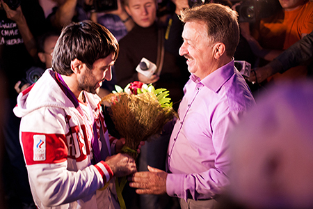 Спортсменов встречала внушительная делегация VIP-персон. Среди них – начальник Управления по физической культуре, спорту и туризму города Евгений Иванов, первый замминистра спорта Челябинской области Леонид Одер, директор Центра олимпийской подготовки по дзюдо Иван Першин, исполнительный директор региональной Федерации дзюдо Денис Лапотышкин и другие. Прибыл и личный тренер чемпиона Александр Миллер. Мансур Исаев первым делом обнял именно его. На глазах наставника выступили едва заметные слезы.