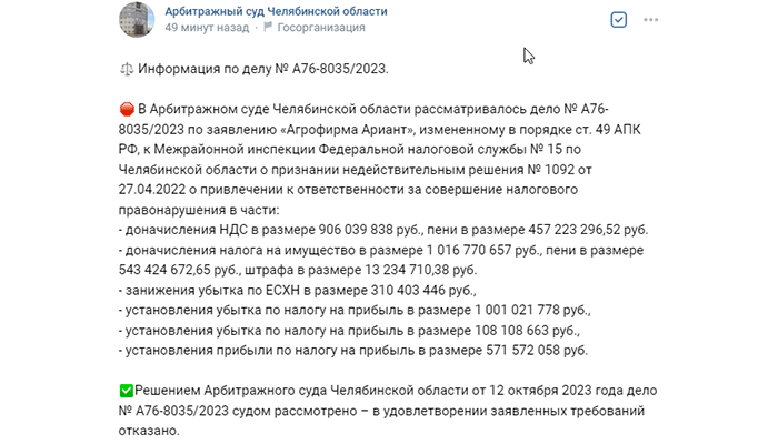 Речь идет о решении № 1092 от апреля 2022 года налоговой межрайонной инспекции ФНС № 15 по Челябинской области. По нему агрофирма привлечена к ответственности за совершение налогового правонарушения в части доначисления к уплате налога на добавленную стоимость (НДС) в размере более 906 млн рублей, пени по НДС – 457,2 млн рублей, налога на имущество в размере 1 млрд рублей, пени по налогу на имущество – 543,4 млн рублей, штрафа в сумме 13,2 млн рублей и других начислений.