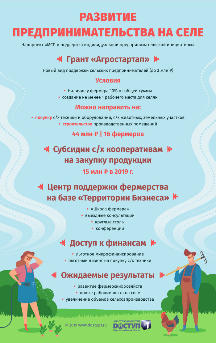 Минсельхоз Челябинской области активно участвует в реализации нацпроекта «Малое и среднее предпринимательство и поддержка индивидуальной предпринимательской инициативы» – все больше предпринимателей с сельской пропиской включаются в региональный проект «Создание системы поддержки фермеров и развитие сельской кооперации в Челябинской области». Детали – в ИНФОГРАФИКЕ Агентства новостей «Доступ».