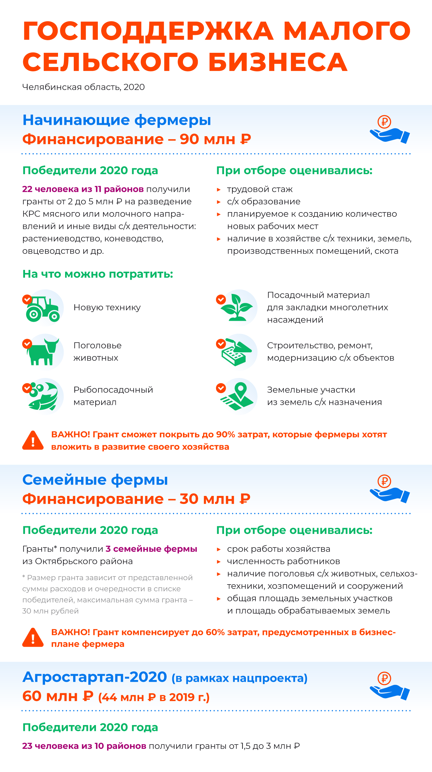 В текущем году в Челябинской области второй раз вручили гранты «Агростартап». Победителями конкурса на получение средств государственной поддержки – грантов на развитие вновь созданного агробизнеса – стали 23 человека из 10 муниципальных районов. Общий размер средств из бюджета на эти цели – 60 млн (44 млн в 2019 году), размер гранта варьируется от 1,5 до 3 млн рублей в зависимости от направления сельскохозяйственного производства — растениеводство или животноводство.