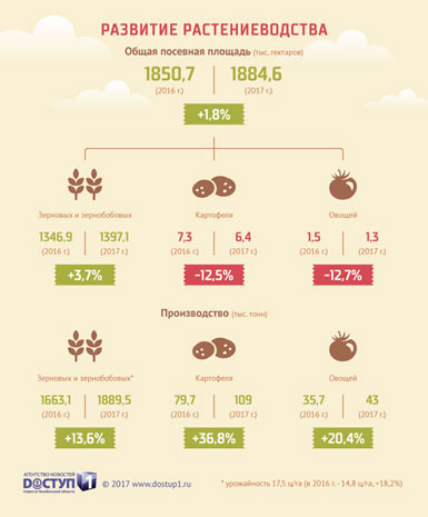 Вместе с ростом валового сбора зерновых и зернобобовых культур с 2012 года также увеличивается их урожайность. По отношению к прошлому году урожайность зерновых и зернобобовых культур выросла на 2,3 центнера с гектара, до 17,7 ц/га. За счет этого валовой сбор пшеницы, ячменя вырос на 14% к уровню прошлого года (на 268 тыс. тонн), зернобобовых (горох, нут, чечевица, люпин) – более чем в два раза (на 226% к уровню 2016 года), овса – на 29%, гречихи – на 83%.