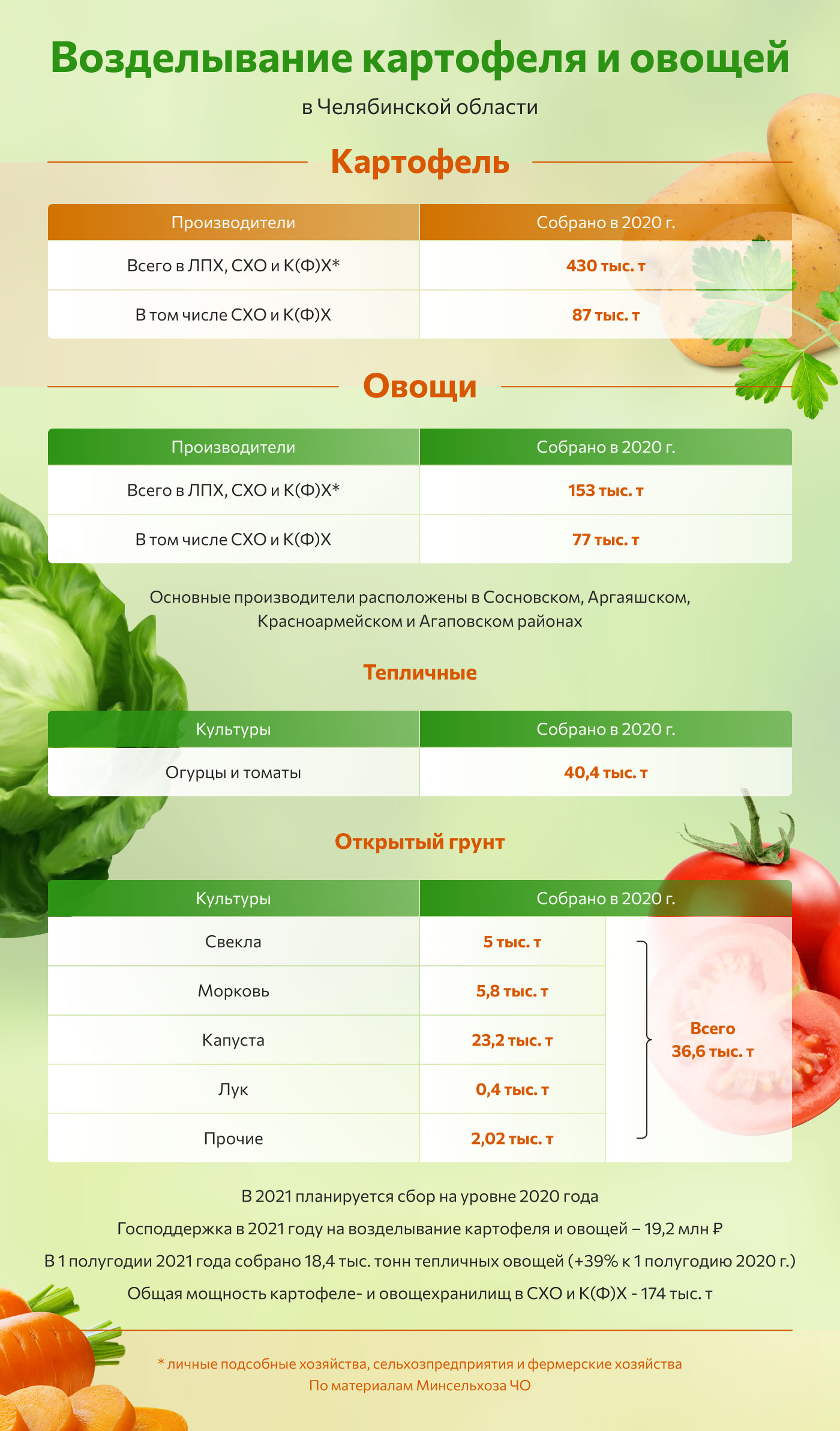Отметим, Челябинская область за счет производства в сельхозорганизациях и личных хозяйствах полностью обеспечена картофелем и овощами (в 2020 году произведено 430 тыс. тонн и 153 тыс. тонн соответственно).