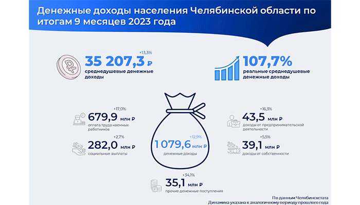 «Денежные доходы по итогам девяти месяцев 2023 года увеличились на 12,9% по отношению к аналогичному периоду 2022-го и составили 1,079 трлн рублей. Реальные располагаемые (за вычетом обязательных платежей, скорректированные на уровень инфляции) составили 8% к январю-сентябрю 2022 года, что выше среднероссийского уровня (4,8%)», – говорится в комментарии.