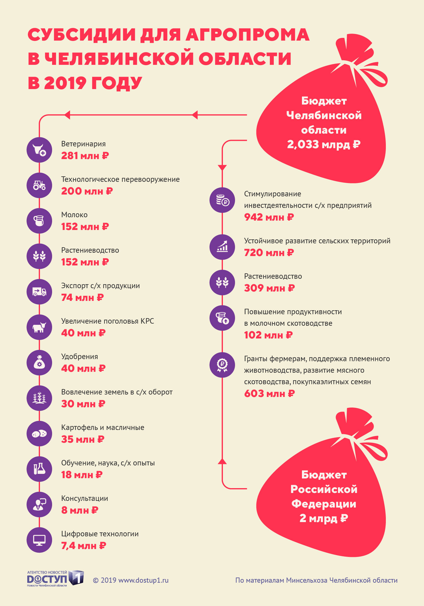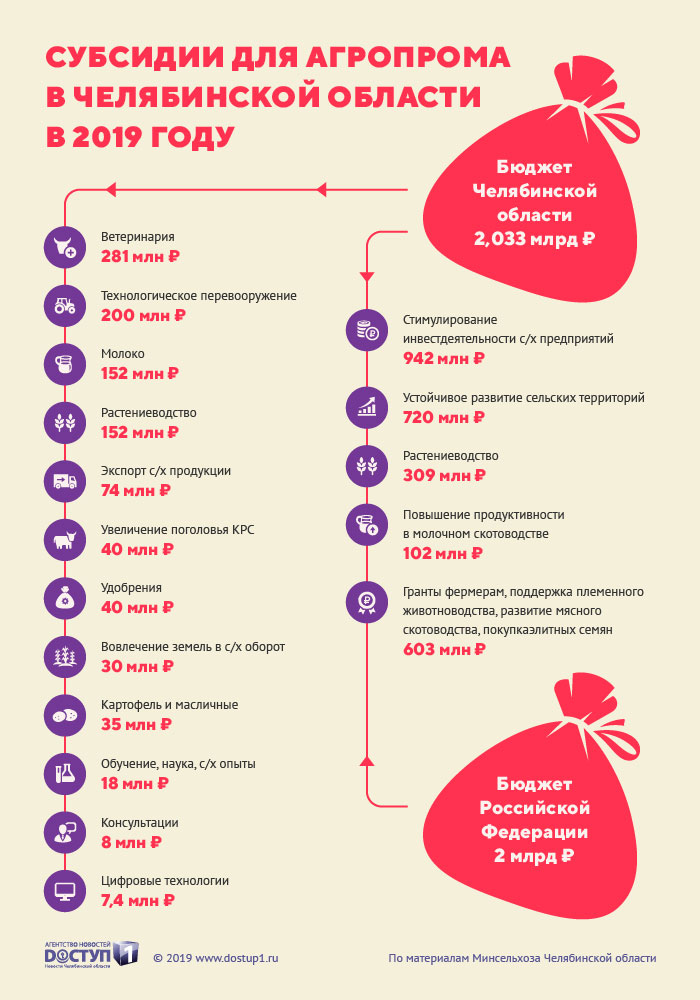 Более 4 млрд рублей будет выделено в 2019 году на поддержку южноуральского агропромышленного комплекса – субсидии будут направляться как из регионального, так и из федерального бюджета, передает корреспондент Агентства новостей «Доступ» со ссылкой на пресс-службу Минсельхоза Челябинской области.