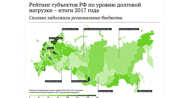 По данным Минфина РФ, суммарный объем государственного долга всех субъектов РФ по итогам 2017 года снизился на 1,6% и на 1 января 2018 года составил 2,315 трлн рублей. Наибольший вклад в снижение суммарного объема госдолга внесли Москва (–27,5 млрд) и Челябинская область (–12,9 млрд).