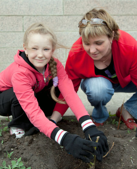 Некоторые сотрудники пришли с детьми, которые охотно помогали родителям поливать высаженные кусты роз.