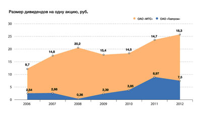 3По данным http://www.company.mts.ru/comp/ir/dividends/, http://www.gazprom.ru/investors/stock/dividends/ и аналитических материалов ОАО «Брокерский дом «ОТКРЫТИЕ».