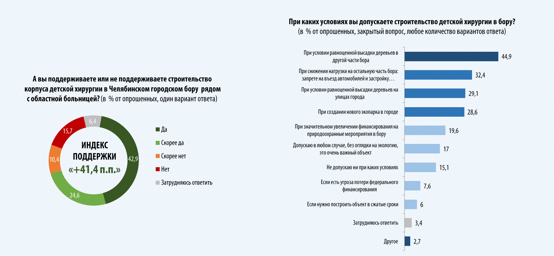 Между тем, согласно опросу центра «Маркетинга и социологии», 67,5% опрошенных челябинцев выступили за строительство детской хирургии в челябинскому бору рядом с ЧОДКБ (42,9% – «да», 24,6% – «скорее, да»). Против такой идеи высказались 26,1% респондентов (15,7% – «нет», 10,4% – «скорее нет»). Еще 6,4% опрошенных затруднились с ответом.