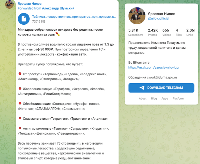 Ранее глава Комитета Госдумы по труду Ярослав Нилов опубликовал в своем Telegram-канале перечень лекарственных препаратов, употребление которых водителем нежелательно или вообще запрещено.