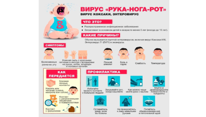 Вирус Коксаки имеет характерный признак – синдром «рука-нога-рот». Он проявляется сыпью и болезненными язвочками на ладонях, подошвах и слизистой рта. Это приводит к затруднению при ходьбе и приеме пищи, вызывая дополнительный дискомфорт у ребенка. Антибиотики на вирусы не действуют.