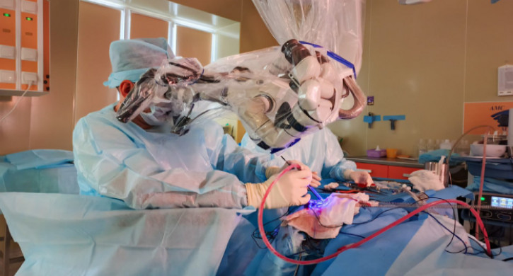 «Когда пациентка обратилась в Челябинский онкоцентр, злокачественное новообразование достигло 8 см в диаметре. Мы использовали специальный флуоресцентный краситель 5-АЛА. При помощи флуоресцентного красителя врачи видят границы опухоли, могут максимально ее удалить», – отметил завотделением нейроонкологии ЧОКЦОиЯМ Андрей Кузьмин.