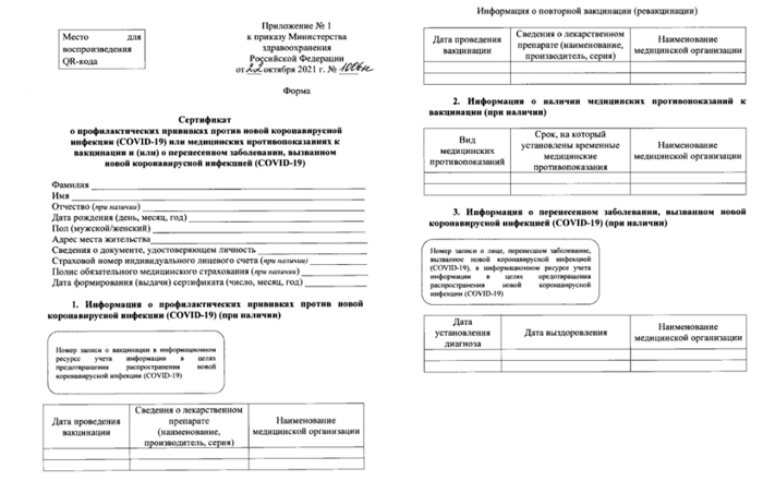 Сертификат будет содержать в себе основные данные о прошедшем вакцинацию гражданине: фамилию, имя, отчество, дату рождения, пол, адрес проживания и дату оформления документа. Также в сертификате предусмотрено место для QR-кода – в левом верхнем углу. В документ будут вноситься информация о месте и времени прививки, данные о вакцине, сведения о ревакцинации, наличии медицинских противопоказаний и ранее перенесенном заболевании.