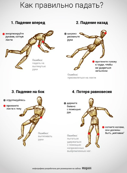 Уже с раннего возраста стоит обучить детей тому, как правильно падать: потеряв равновесие, нужно присесть, сгруппироваться, согнуть спину, прижать подбородок к груди, а локти – к бокам. Необходимо постараться упасть на бок. Очень опасно при падении выставлять прямые руки. Но лучше всего предотвращать падения: удобная и нескользящая обувь, невысокий каблук, нетяжелая сумка (желательно не через плечо) уже снизят риск падения. Пожилым людям пригодятся специальные трости с выдвижным шипом. На скользких участках перемещайтесь неспешно, перенося вес на всю стопу равномерно. Почувствовали, что «повело»? Постарайтесь упасть правильно, и пусть при этом шанс сохранить чистоту одежды становится минимальным, зато риск повредить себе что-нибудь сводится к нулю.