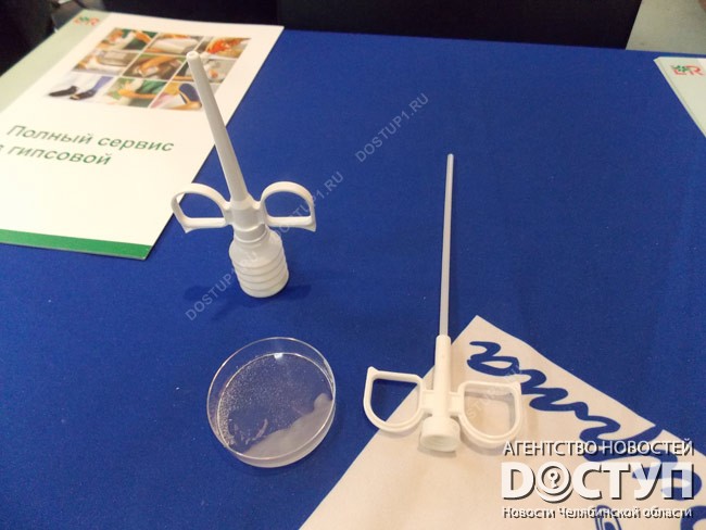 Еще один уникальный экспонат – гемостатик, который необходим для остановки кровотечения во время хирургических операций. В специальный шприц закачивается порошок, который впитывает жидкую составляющую крови и превращает ее в желе, которое смывается или рассасывается. Существует несколько насадок для операций разной сложности.
