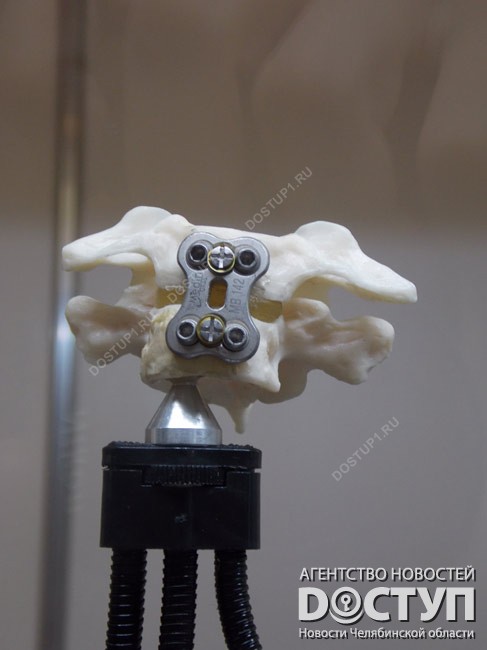 Кроме того, ученые продемонстрировали аппарат для введения в тело человека титанового протеза межпозвоночного диска.