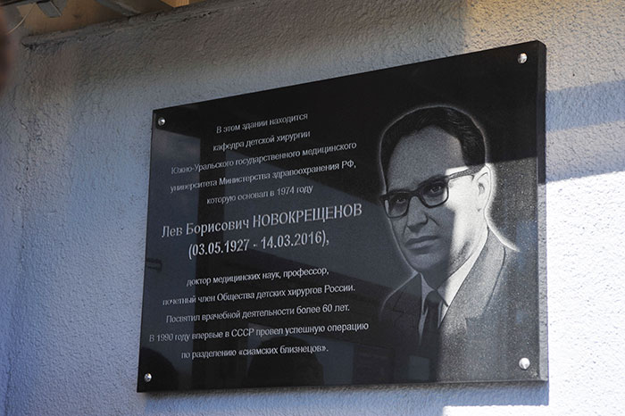 Сегодня, 8 июня, на стене Челябинской областной клинической детской больницы появилась мемориальная табличка выдающемуся хирургу Льву Новокрещенову – в 1990 году он впервые в СССР провел уникальную операцию по разделению сиамских близнецов Ани и Тани Коркиных, родившихся в столице Южного Урала, передает корреспондент Агентства новостей «Доступ».