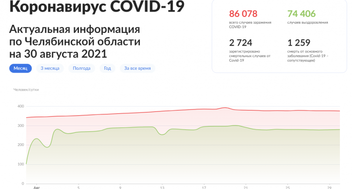 По данным регионального Минздрава, на утро 30 августа зарегистрировали 376 новых случаев заражений. С начала пандемии подтверждено 86 тыс. и 78 случаев заболевания. Сейчас лечение проходят 7 647 южноуральцев.