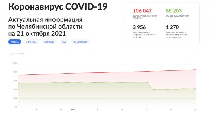 По данным регионального Минздрава, к утру 21 октября в Челябинской области COVID-19 заразились 429 человек. Сейчас лечение проходят 12 тыс. 576 человек. С начала пандемии ковид диагностировали 106 тыс. и 47 южноуральцам.