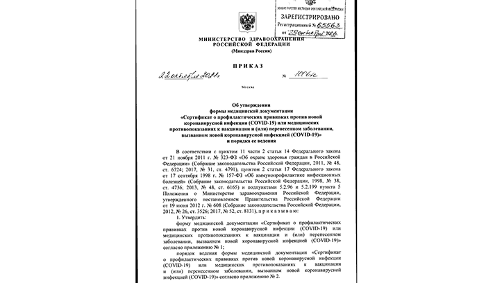 «Утвердить: форму и порядок медицинской документации "Сертификат о профилактических прививках против новой коронавирусной инфекции (COVID-19) или медицинских противопоказаниях к вакцинации и (или) перенесенном заболевании, вызванном новой коронавирусной инфекцией"», – говорится в приказе Минздрава.