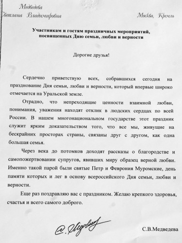 Праздник всероссийского масштаба, День семьи, любви и верности, получил одобрение Межрелигиозного совета России. По предложению Светланы Медведевой символом праздника была выбрана ромашка.