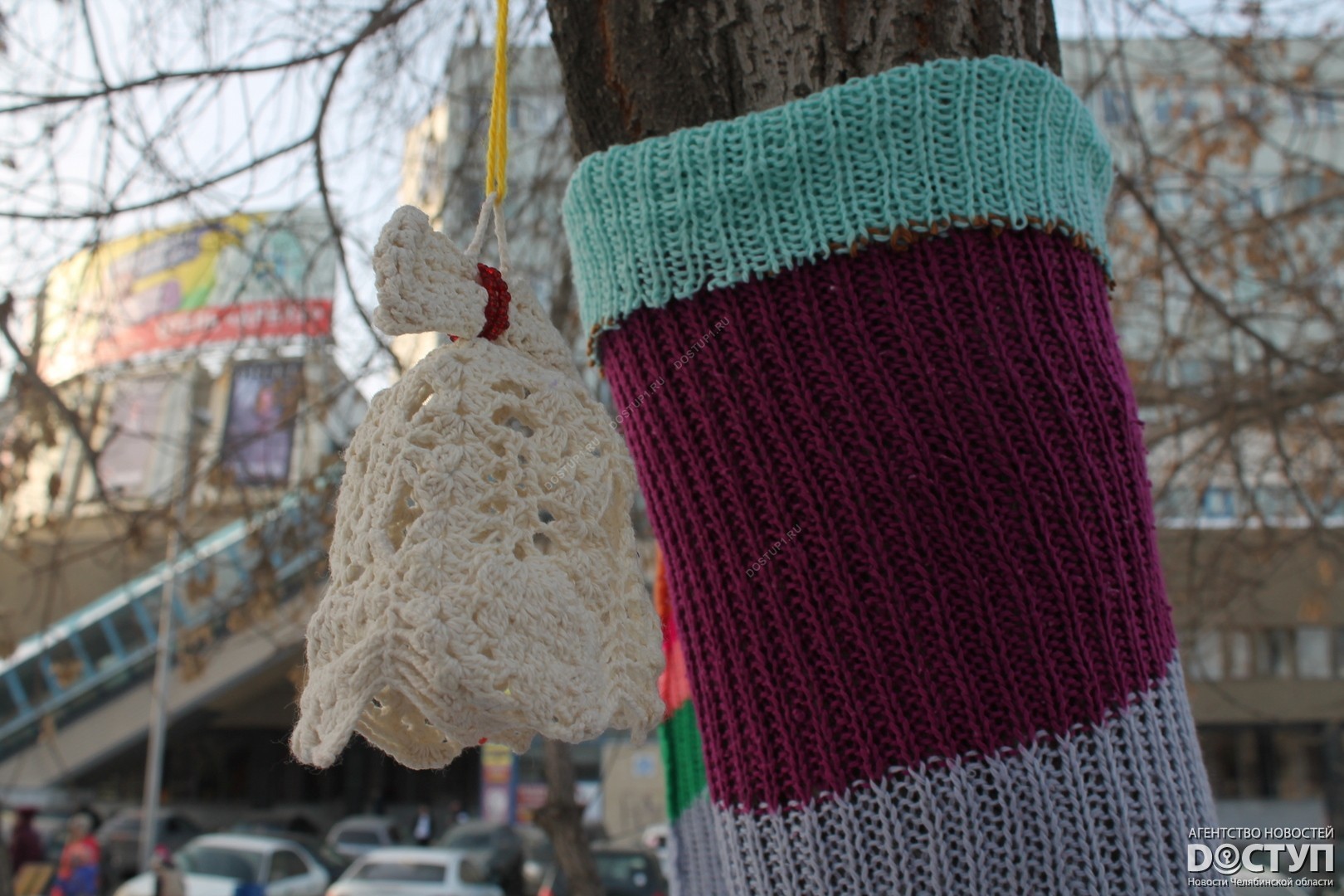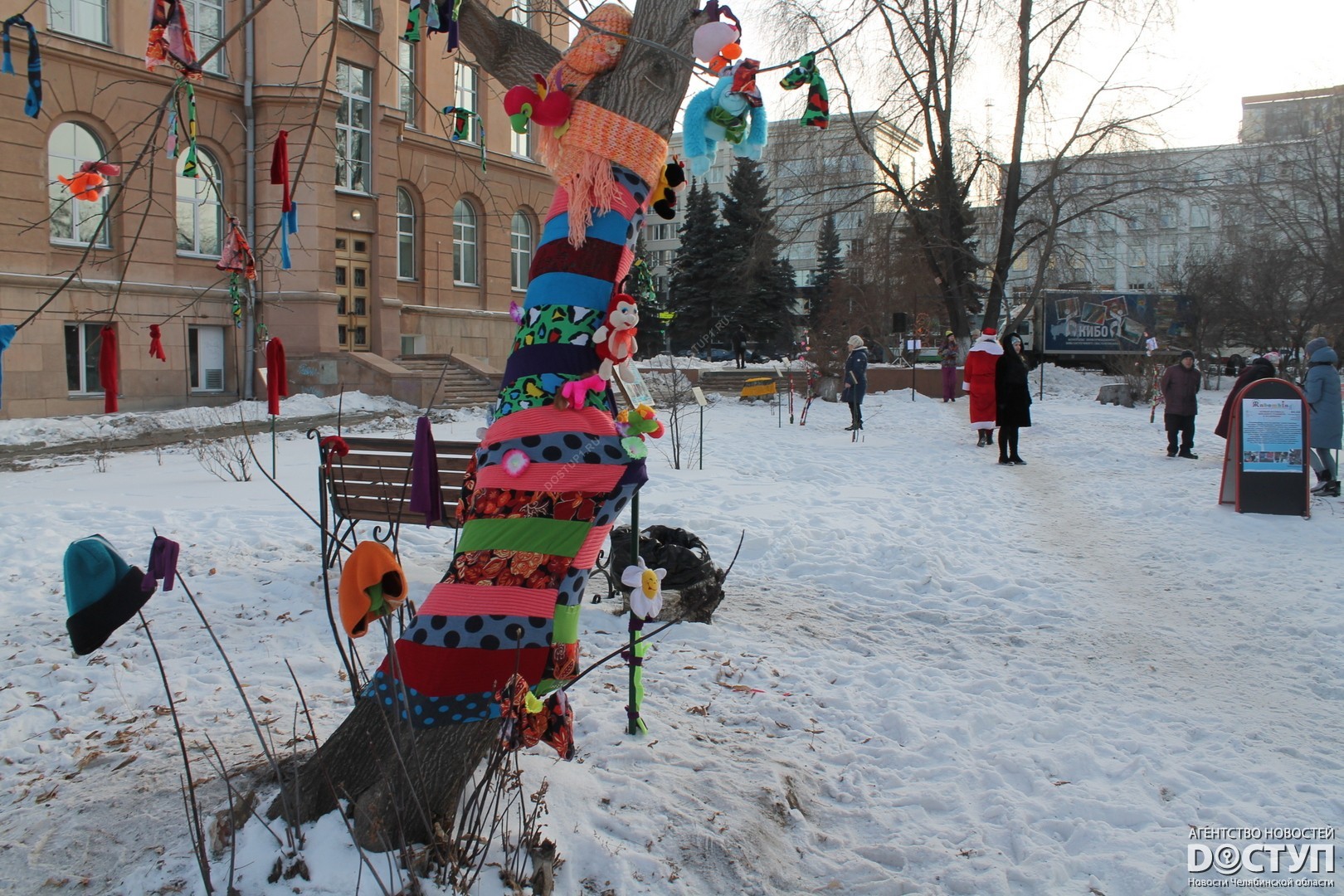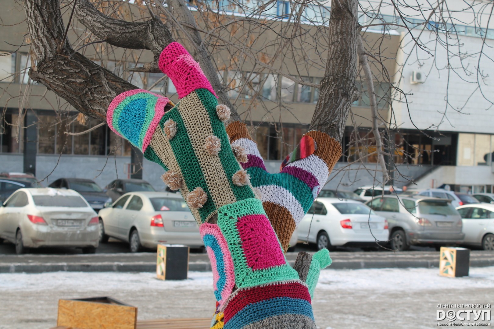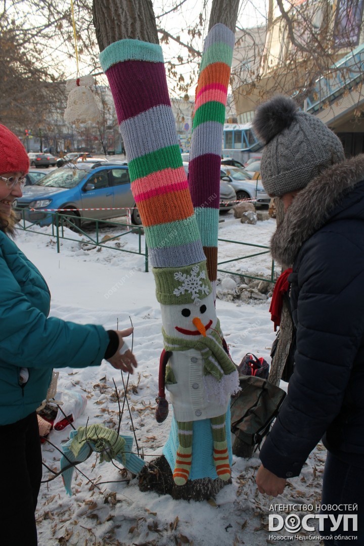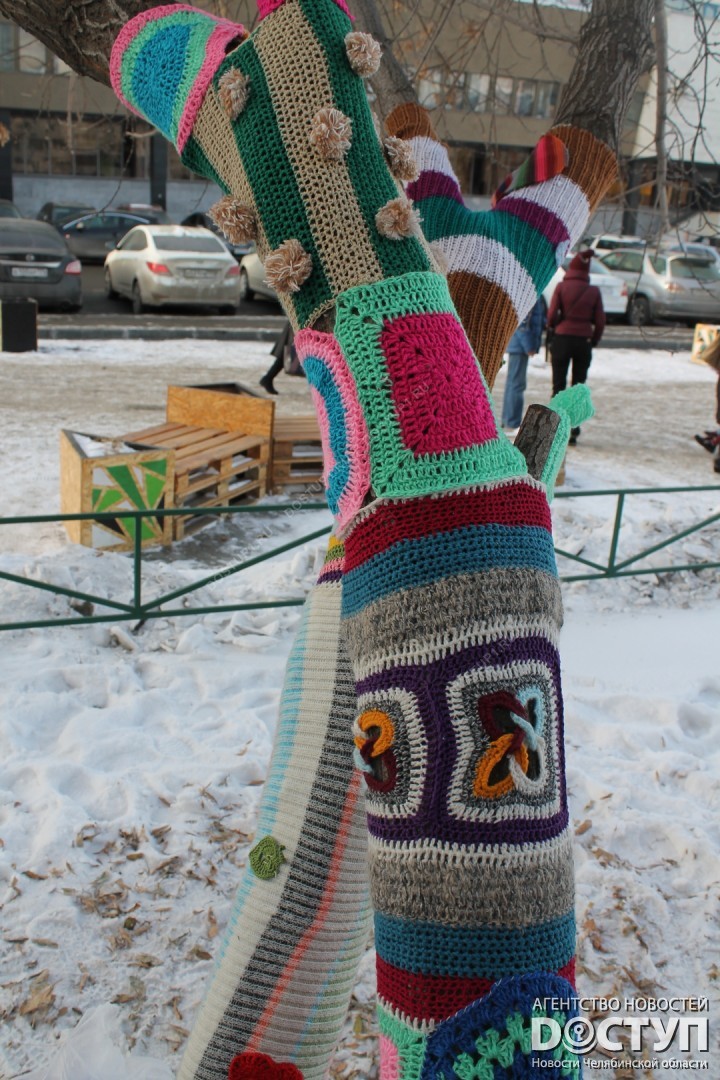 В четверг, 21 декабря, в Челябинске прошел первый фестиваль ярнбомбинга «РасКраски», в ходе которого участники создали своеобразные чехлы для деревьев, лавочек и уличных фонарей.