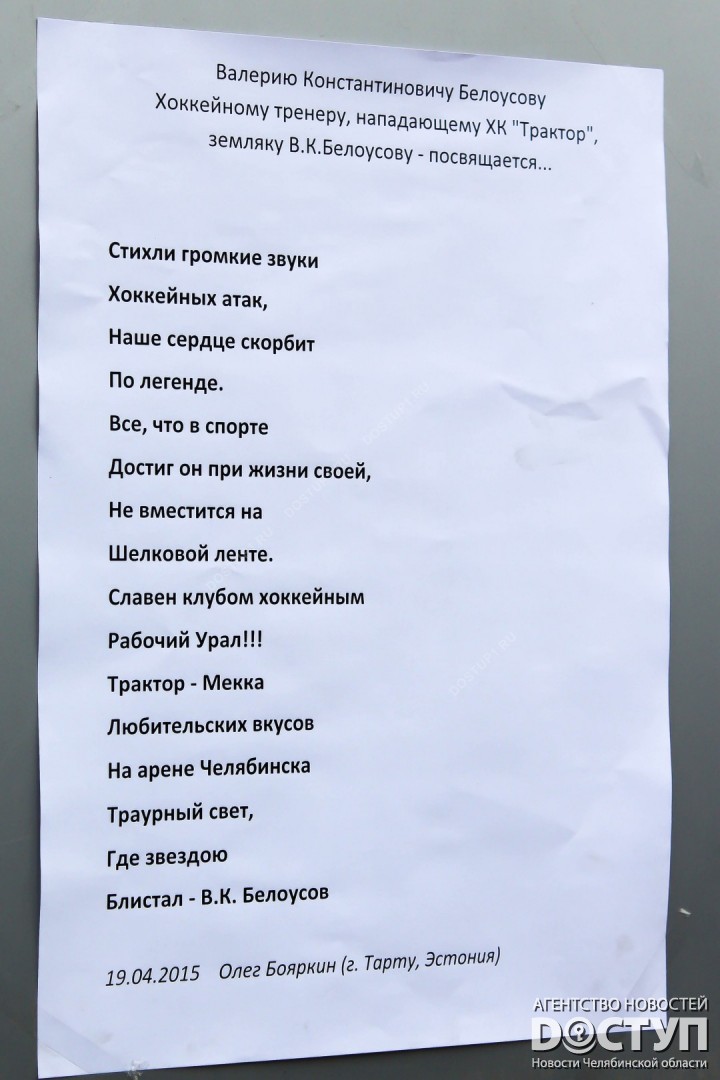 Великого хоккейного тренера проводили в последний путь более десяти тысяч челябинцев. Сегодня, 20 апреля, в ледовой арене «Трактор» челябинцы простились с легендой не только южноуральского, но и российского и мирового хоккея. От 10 до 15 тысяч человек пришли отдать дань памяти Валерию Белоусову – легендарному хоккеисту и тренеру. Проводили в последний путь коллегу, друга, товарища и известные в прошлом хоккеисты и спортивные руководители. Среди них Геннадий Величкин, Геннадий Цыгуров, Николай и Юрий Макаровы, Николай Суханов, Владимир Кречин, Равиль Гусманов, Андрей Сапожников, Валерий Никулин и многие-многие другие.