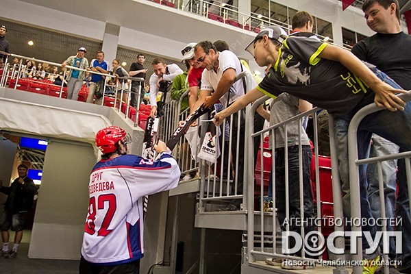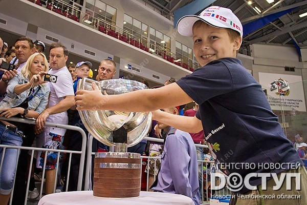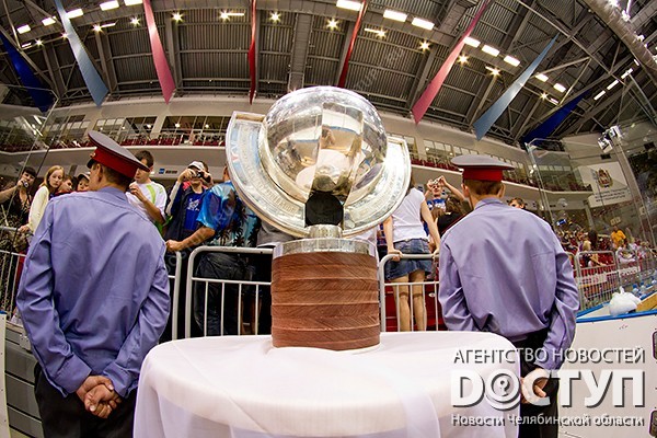 Почетный трофей в южноуральскую столицу привезли чемпионы мира-2012 Евгений Кузнецов и Евгений Медведев. Презентацию Кубка предварял благотворительный матч по сбору средств на лечение Диме Ащепкову. Годовалый мальчик, больной раком крови, в настоящее время находится в клинике Израиля.
