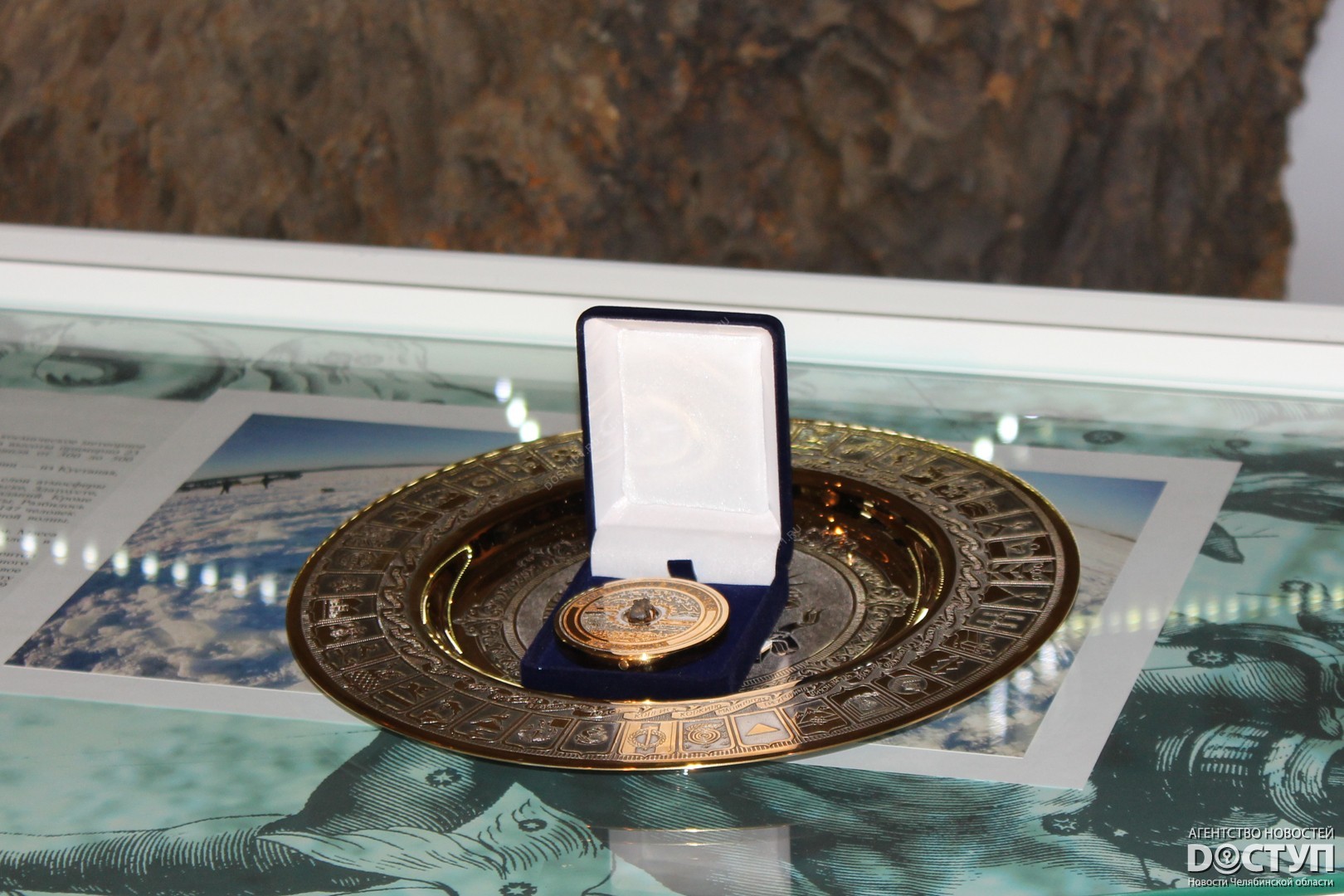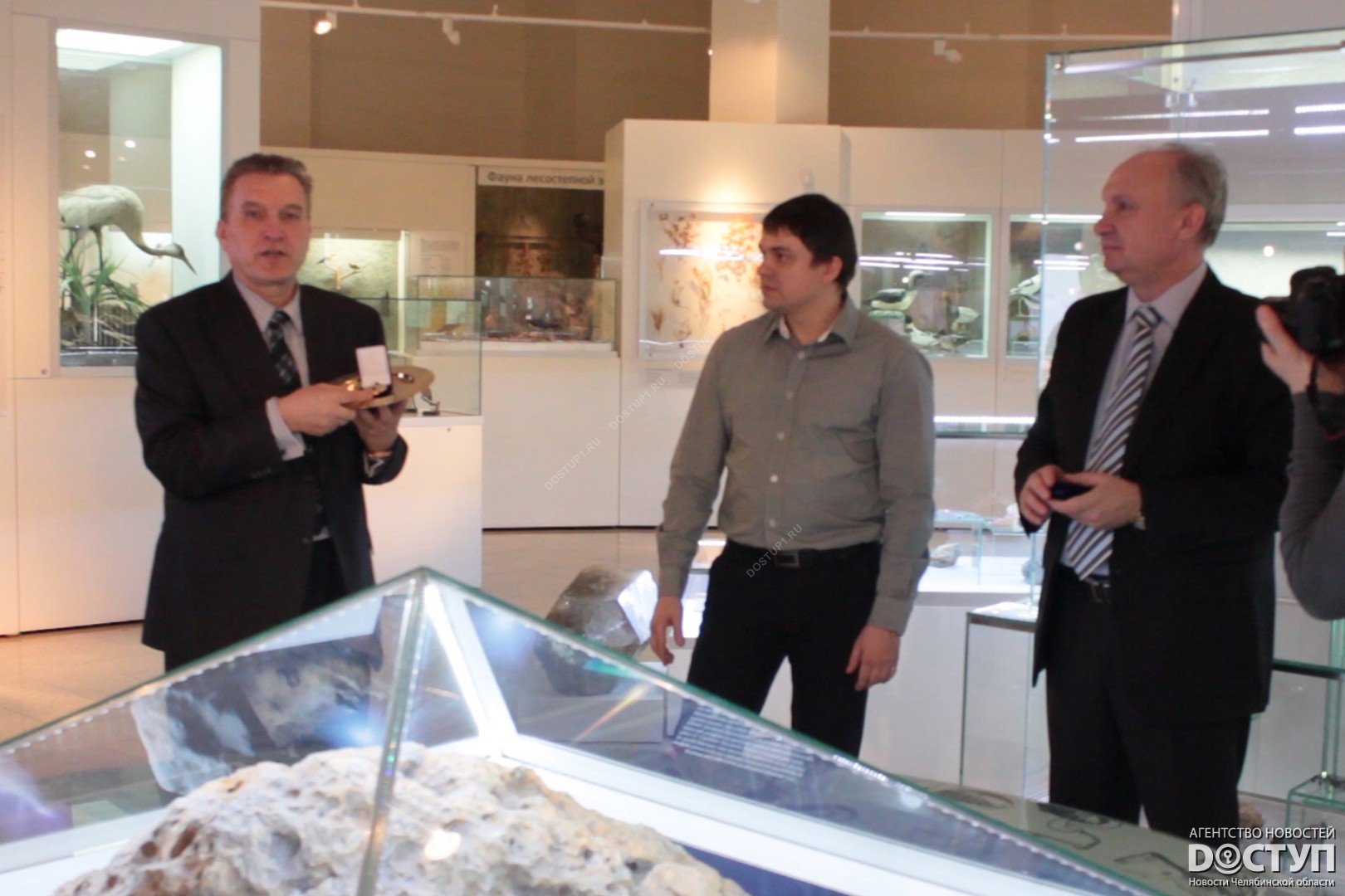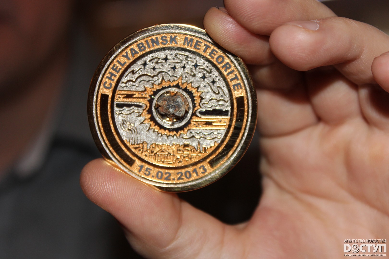 Сегодня, 3 февраля, в Челябинском краеведческом музее презентовали две медали, выполненные с фрагментами метеорита. Одна из них отправится представлять Южный Урал на Олимпийскую выставку в Сочи, другая останется в фондах челябинского музей. Изделие с осколком космического тела директору краеведческого музея в торжественной обстановке вручил заместитель министра культуры Челябинской области Вячеслав Харюшин.