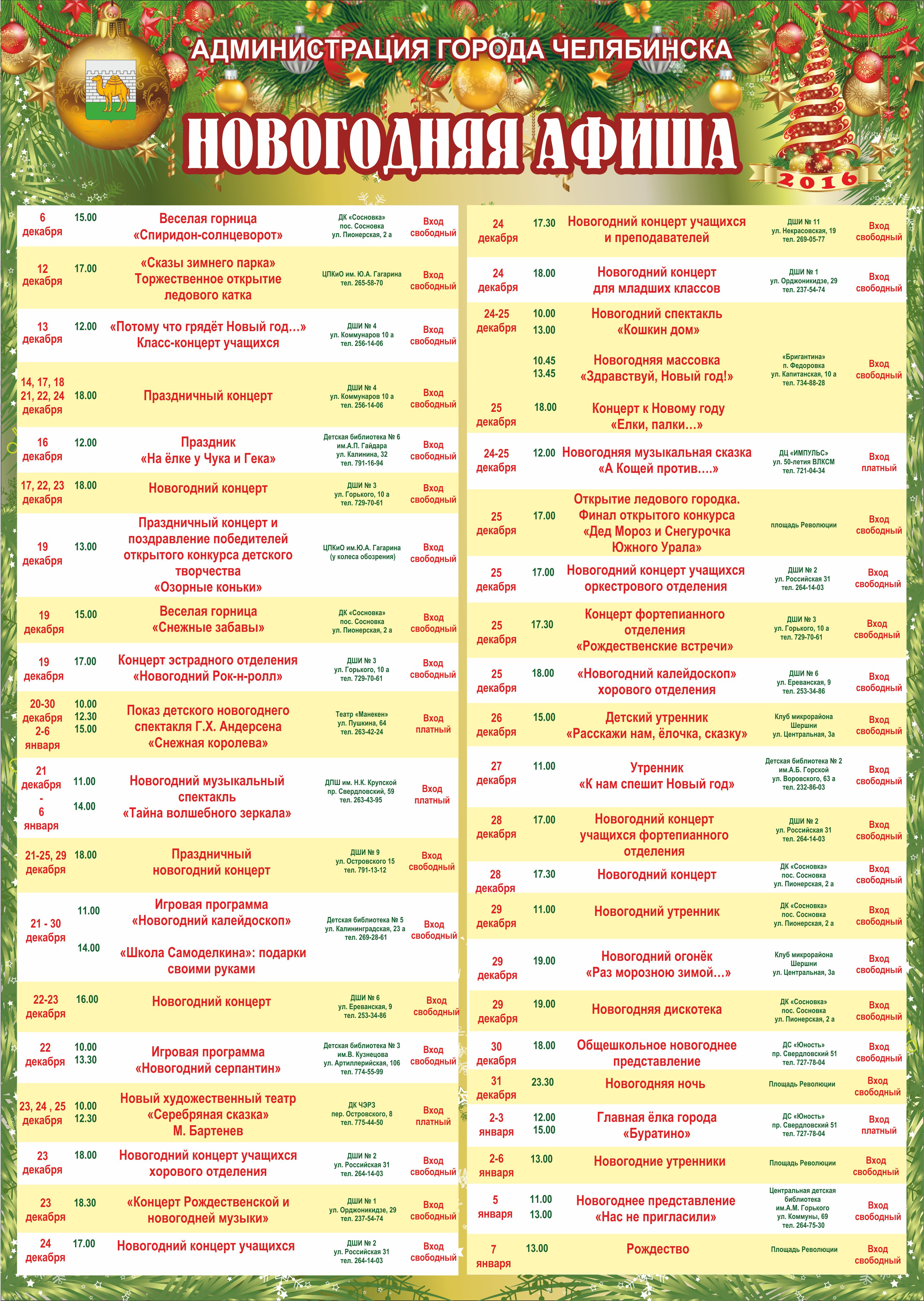 Челябинск погружается в предновогоднюю праздничную атмосферу – с 6 декабря в учреждениях культуры стартуют концерты, спектакли и творческие вечера, передает корреспондент Агентства новостей «Доступ» со ссылкой на пресс-секретаря начальника управления культуры города Викторию Олиферчук.