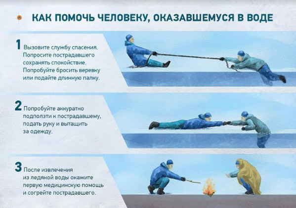 - осторожно вытащите пострадавшего на лед и вместе с ним ползком выбирайтесь из опасной зоны. Доставьте его в безопасное место. Окажите ему помощь: снимите с него мокрую одежду, энергично разотрите тело (до покраснения кожи), напоите горячим чаем.