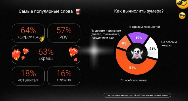 «Дзен» составил топ сленговых слов поколения зумеров – самыми популярными у россиян в возрасте от 14 до 25 лет стали слова: «форсить» (от англ. force; быстро и активно продвигать идею или товар); «краш» (предмет обожания) и POV (калька с англ. point of view – «точка зрения», означает повествование от первого лица), передает корреспондент Агентства новостей «Доступ».
