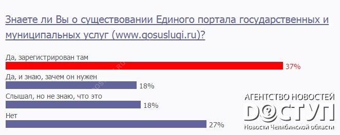 Популярность портала госуслуг подтверждает опрос на главной странице АН «Доступ». 37% наших читателей знают о существовании сайта gosuslugi.ru, зарегистрированы там и пользуются предоставленными возможностями. Против них – 27% пользователей, которые игнорируют «электронный комфорт», либо же действительно ничего не слышали об относительно новом портале.