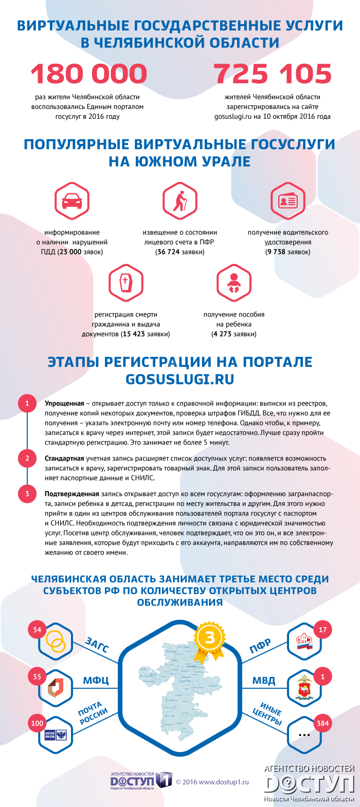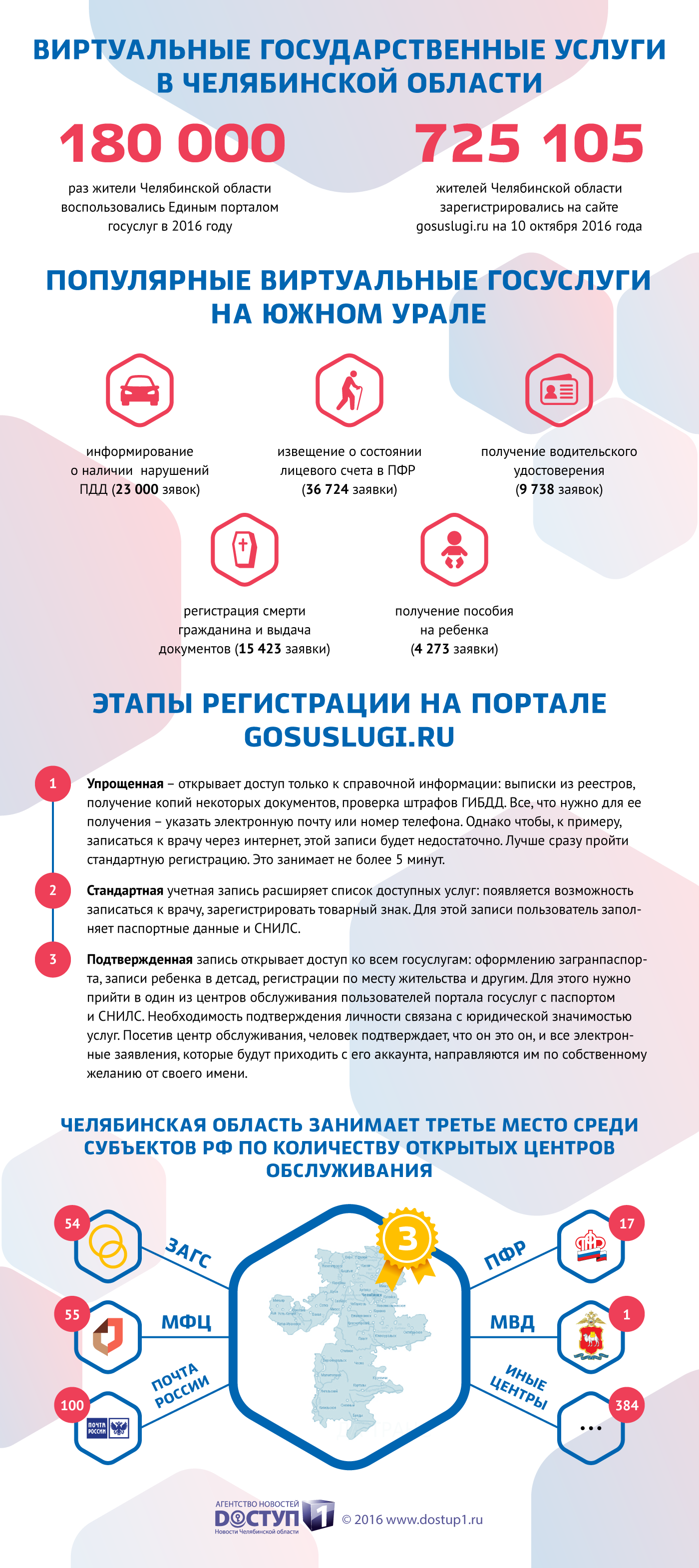 В 2016 году от жителей Челябинской области поступило 180 тыс. заявок на электронные госуслуги – чаще всего южноуральцы проверяют состояние индивидуального лицевого счета в Пенсионном фонде и получают информацию по штрафам ГИБДД, передает корреспондент Агентства новостей «Доступ».