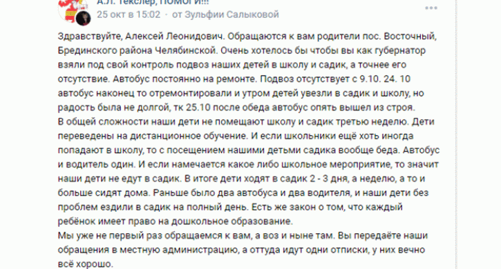 В ходе мониторинга социальных сетей Следственным комитетом выявлена публикация, в которой южноуральцы сообщают, что «должностными лицами не принимается мер по организации перевозок 25 несовершеннолетних из отдаленных поселков в ближайшие образовательные учреждения».