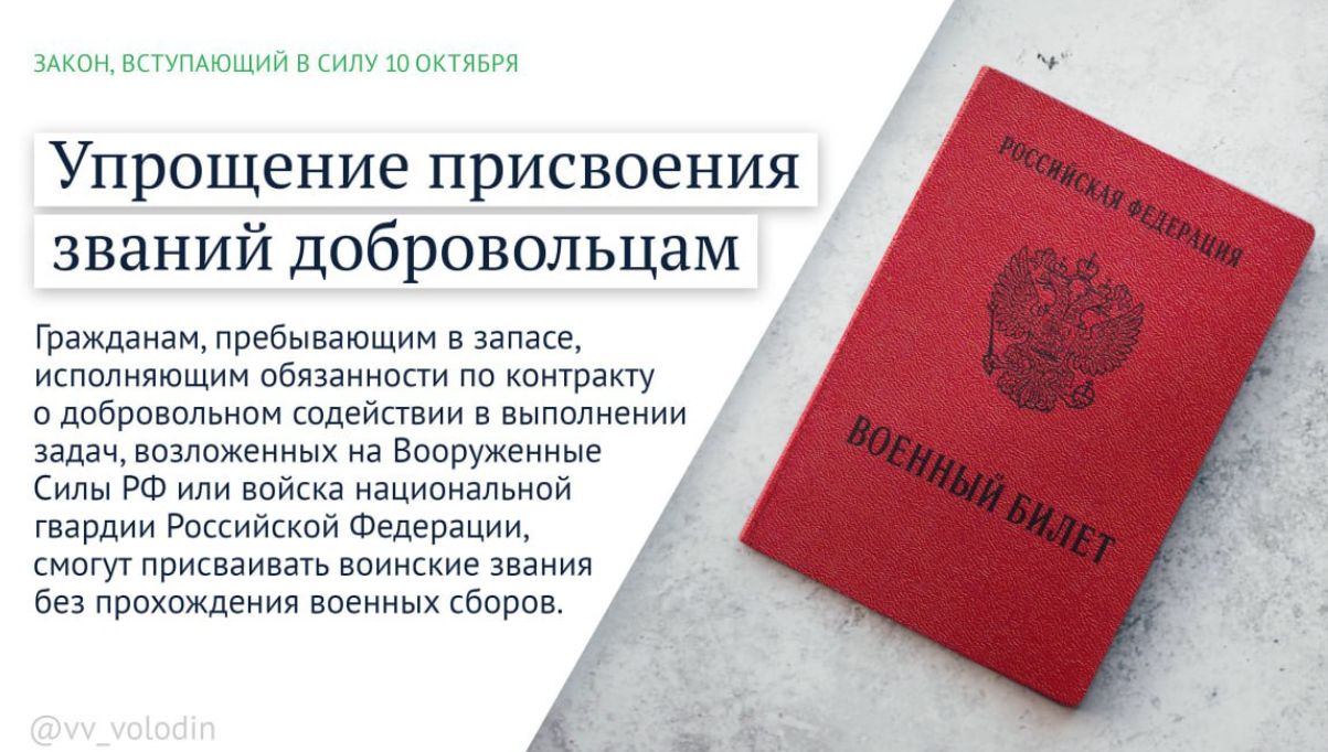 10 октября. Упрощение присвоения званий добровольцам. Гражданам, пребывающим в запасе, исполняющим обязанности по контракту о добровольном содействии в выполнении задач, возложенных на Вооруженные Силы РФ или войска национальной гвардии Российской Федерации, смогут присваивать воинские звания без прохождения военных сборов.