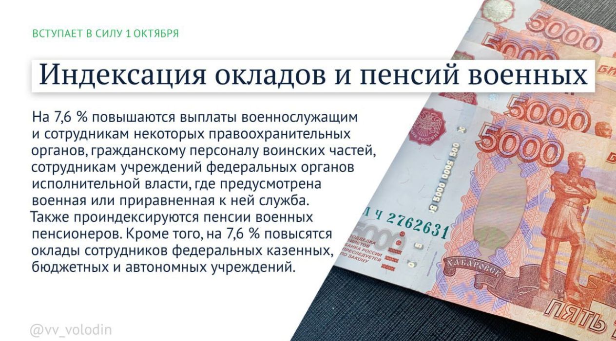 Индексация окладов и пенсий военных. На 7,6% повышаются выплаты военнослужащим и сотрудникам некоторых правоохранительных органов, гражданскому персоналу воинских частей, сотрудникам учреждений федеральных органов исполнительной власти, где предусмотрена военная или приравненная к ней служба. Также проиндексируются пенсии военных пенсионеров. Кроме того, на 7,6% повысятся оклады сотрудников федеральных казенных, бюджетных и автономных учреждений.