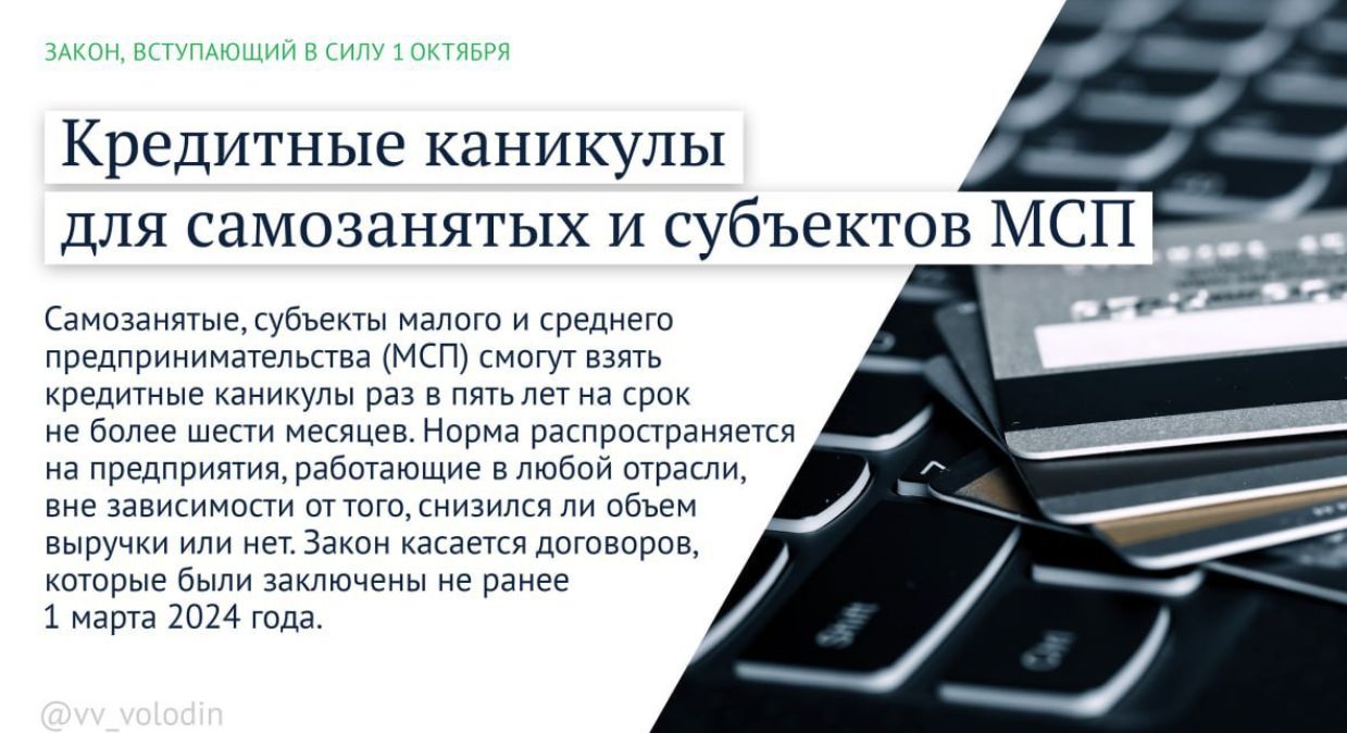 1 октября. Кредитные каникулы для самозанятых и субъектов МСП. Самозанятые, субъекты малого и среднего предпринимательства (МСП) смогут взять кредитные каникулы раз в пять лет на срок не более шести месяцев. Норма распространяется на предприятия, работающие в любой отрасли, вне зависимости от того, снизился ли объем выручки или нет. Закон касается договоров, которые были заключены не ранее 1 марта 2024 года.