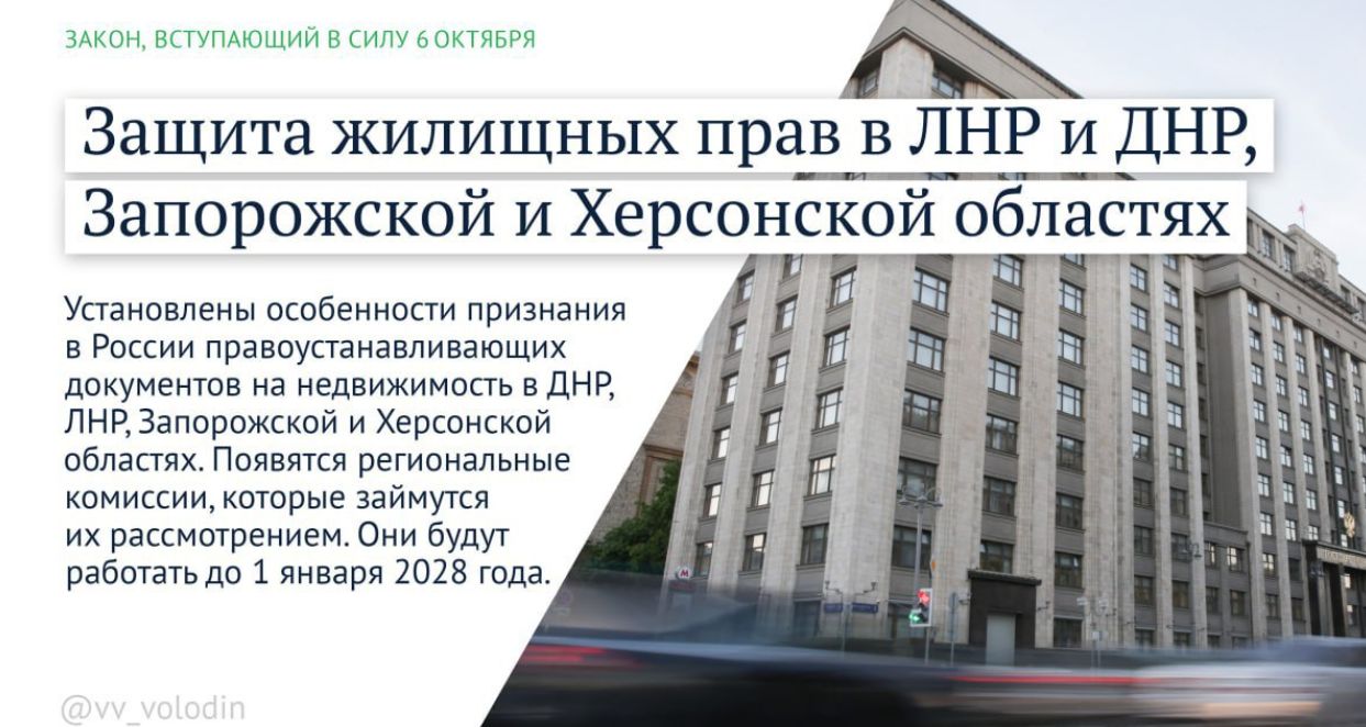 6 октября. Защита жилищных прав в ЛНР и ДНР, Запорожской и Херсонской областях. Установлены особенности признания в России правоустанавливающих документов на недвижимость в ДНР, ЛНР, Запорожской и Херсонской областях. Появятся региональные комиссии, которые займутся их рассмотрением. Они будут работать до 1 января 2028 года.