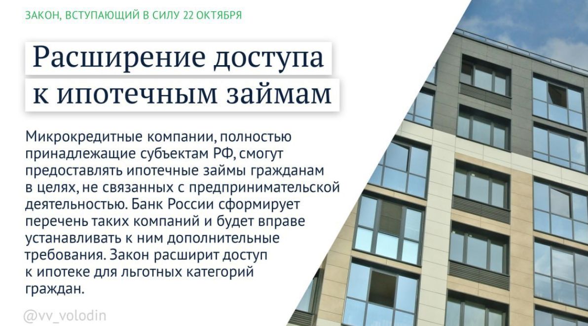 22 октября. Расширение доступа к ипотечным займам. Микрокредитные компании, полностью принадлежащие субъектам РФ, смогут предоставлять ипотечные займы гражданам в целях, не связанных с предпринимательской деятельностью. Банк России сформирует перечень таких компаний и будет вправе устанавливать к ним дополнительные требования. Закон расширит доступ к ипотеке для льготных категорий граждан.