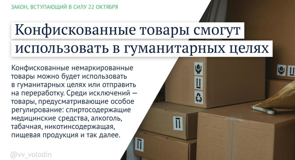 Конфискованные товары смогут использовать в гуманитарных целях. Конфискованные немаркированные товары можно будет использовать в гуманитарных целях или отправить на переработку. Среди исключений – товары, предусматривающие особое регулирование: спиртосодержащие медицинские средства, алкоголь, табачная, никотинсодержащая, пищевая продукция и так далее.