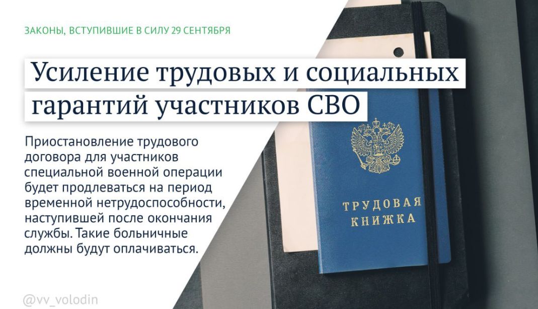 Усиление трудовых и социальных гарантий участников СВО. Приостановление трудового договора для участников специальной военной операции будет продлеваться на период временной нетрудоспособности, наступившей после окончания службы. Такие больничные должны будут оплачиваться.