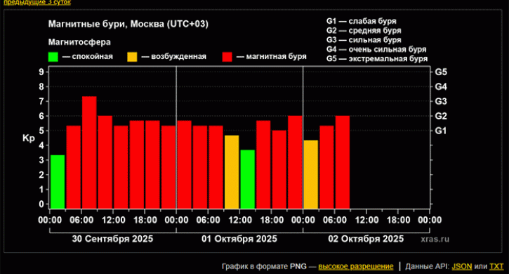 С двумя небольшими перерывами – днем в среду, а также минувшей ночью – продолжается до сих пор. Ее интенсивность держится в диапазоне слабой магнитной бури, немного превышает уровень G1, но до умеренной магнитной бури, G2, пока не дотягивает.