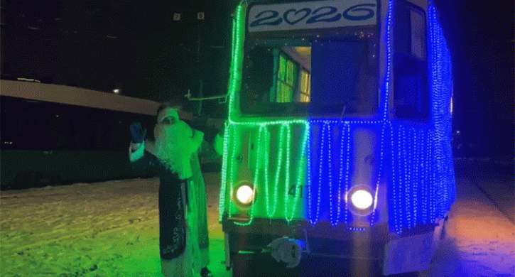 Вышел на маршрут сияющий трамвай, который будет курсировать по городу все новогодние каникулы.