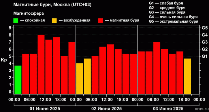 «Исключительно длинная серия непрерывных геомагнитных бурь и возмущений, запущенная утром 1 июня с приходом к Земле выброса массы от вспышки 31 мая, продолжается уже около 66 часов и пока не прекратилась. В настоящее время индекс Kp, характеризующий состояние магнитного поля, находится на желтом уровне, равном 4, причем спустился в эту зону впервые за сутки после 36 часов непрерывных магнитных бурь», – говорится в комментарии Лаборатории солнечной астрономии (ИКИ РАН и ИСЗФ СО РАН).