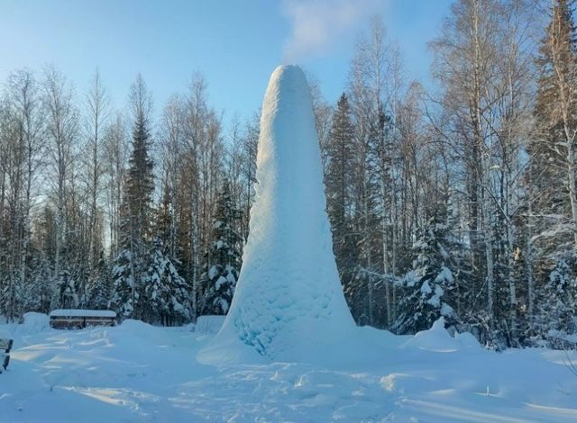 Достопримечательность возникла, когда геологи пробурили разведочную скважину. Полезных ископаемых не нашли, зато попали в артезианский бассейн, хлынула струя воды. Специалисты забили заглушку, но напор воды был такой силы, что вскоре ее выбило. С тех пор в этом месте из земли бьет фонтан. Замерзая, он образует причудливую сосульку из голубого льда высотой до 14-16 метров.